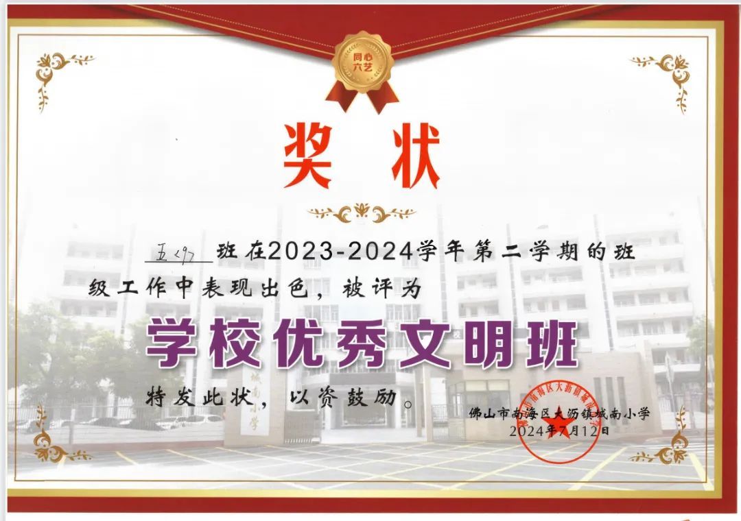 在班级管理中,我以“立德树人”为核心目标,在大沥镇教育发展中心德育工作的指导下,深化我校“同心六艺”教育理念,因班制宜、因生施教,深入落实班务常规管理。同时,落实班级管理四字方针——“管、教、罚、爱”。