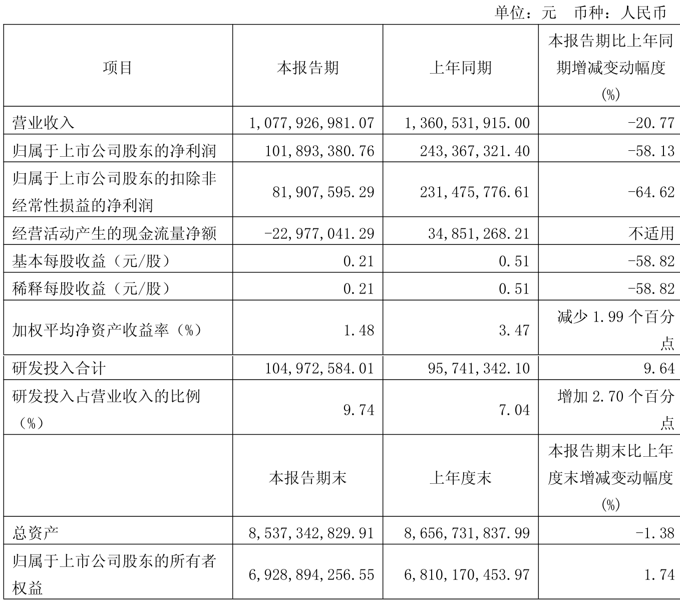 中证智能财讯华熙生物(688363)4月26日披露2025年第一季度报告。公司实现营业总收入10.78亿元,同比下降20.77%;归母净利润1.02亿元,同比下降58.13%;扣非净利润8190.76万元,同比下降64.62%;经营活动产生的现金流量净额为-2297.7万元,上年同期为3485.13万元;报告期内,华熙生物基本每股收益为0.21元,加权平均净资产收益率为1.48%。